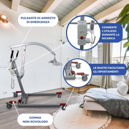 MAGGIORE SICUREZZA: riduce il rischio di lesioni o cadute sia per il paziente che per l'operatore sanitario. È dotato di un gancio che consente all'utente di sorreggere il paziente durante i trasferimenti per garantirne la stabilità. Include anche un pulsante di arresto di emergenza, che consente di sollevare o abbassare manualmente il paziente se necessario.