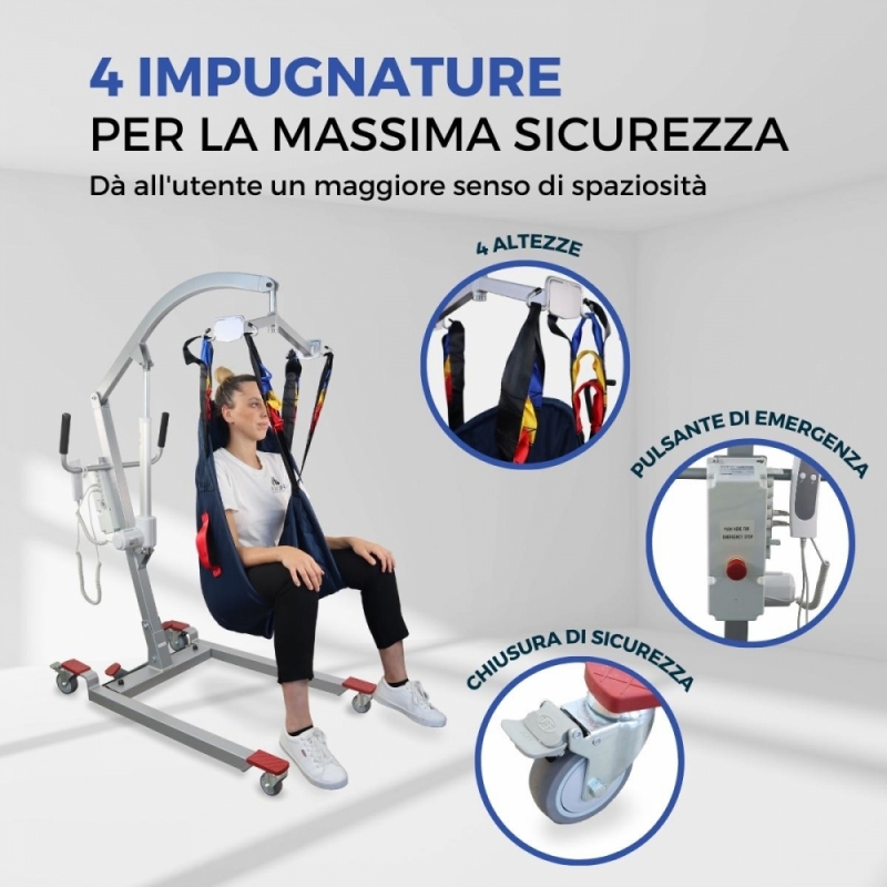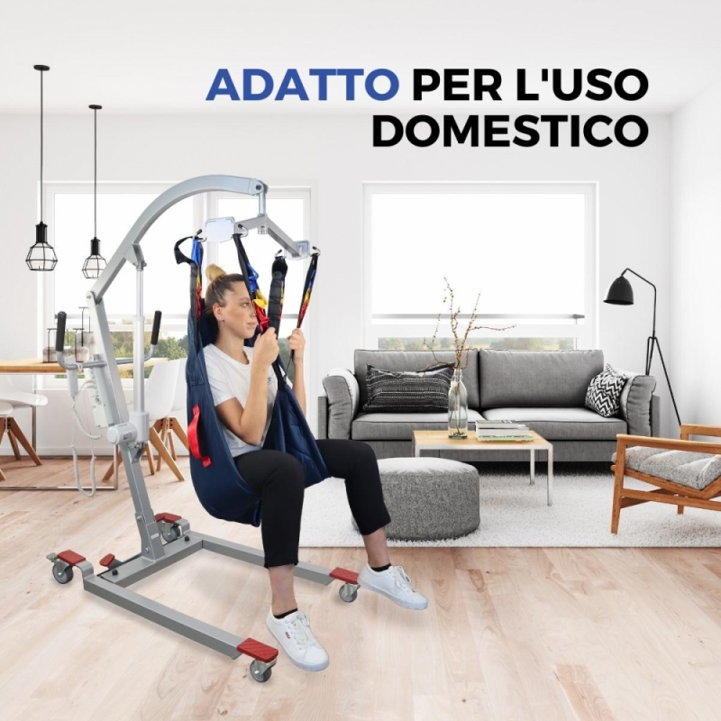 ADATTABILE : la larghezza delle gambe è regolabile, quindi passa facilmente attraverso le porte grazie ai pedali che regolano la larghezza della base. Permette inoltre di trasportare tutti i tipi di persone con mobilità ridotta temporanea o permanente , indipendentemente dalle loro caratteristiche fisiche. È possibile sollevare l'utente da un letto, una sedia, un bagno o persino da terra.