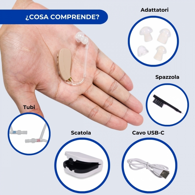 L' amplificatore EarPlus ha anche una lunga durata della batteria, intorno alle 20 e 24 ore, che ne consente l'utilizzo quotidiano grazie al tempo di ricarica di sole 2 ore. Puoi caricare il tuo dispositivo mentre riposi la notte! Tra i suoi accessori comprende una serie di pezzi di ricambio o adattatori, un cavo USB, una custodia protettiva e una spazzola per la pulizia con cui garantirne l'igiene.