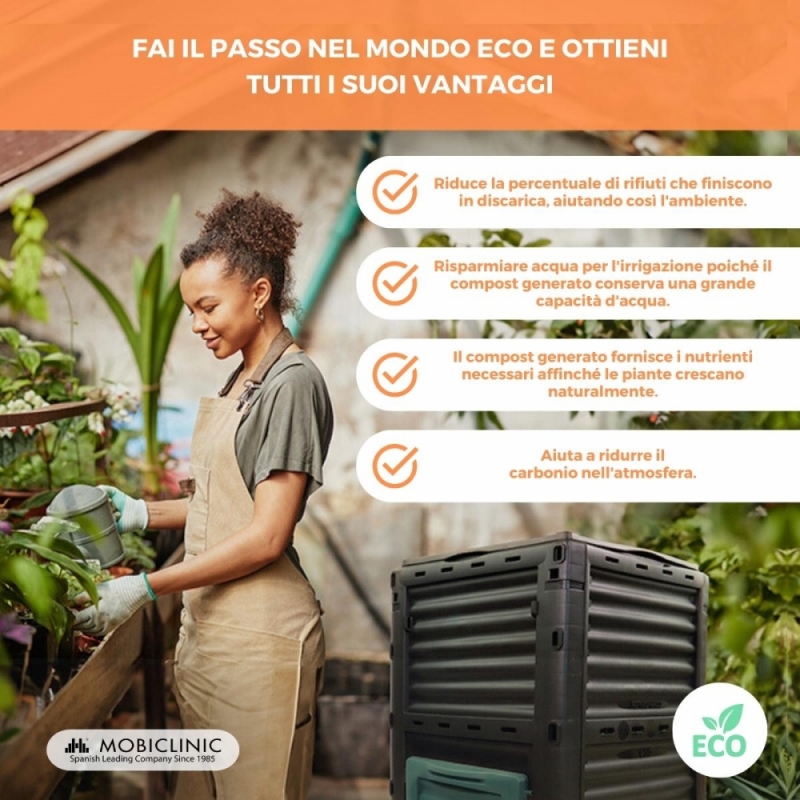 Se ti impegni per un pianeta più sostenibile e ti piace coltivare i tuoi raccolti, questa compostiera per rifiuti riduce la percentuale di rifiuti che finiscono nelle discariche, contribuendo così all'ambiente. Il suo impegno ecologico, infatti, riduce la nostra impronta di carbonio nell’atmosfera grazie alla riduzione diretta delle emissioni di gas serra nelle discariche e negli inceneritori.