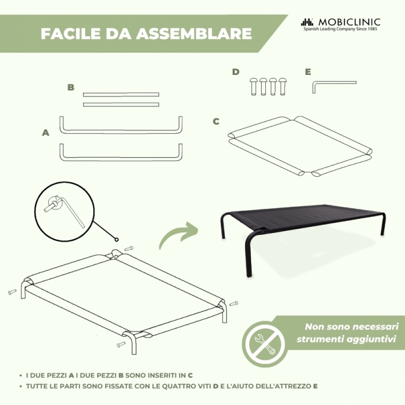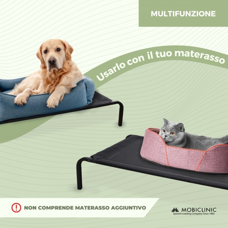 Questo letto alto per animali domestici è ideale sia per gli spazi interni che per quelli esterni. Grazie alla sua leggerezza e alle sue dimensioni, potrete portarlo con voi in salotto o in giardino senza alcun problema, così il vostro cane potrà riposare sempre accanto a voi ovunque voi siate. Dal design semplice ed intuitivo, lo avrai assemblato in pochi minuti e senza bisogno di attrezzi.