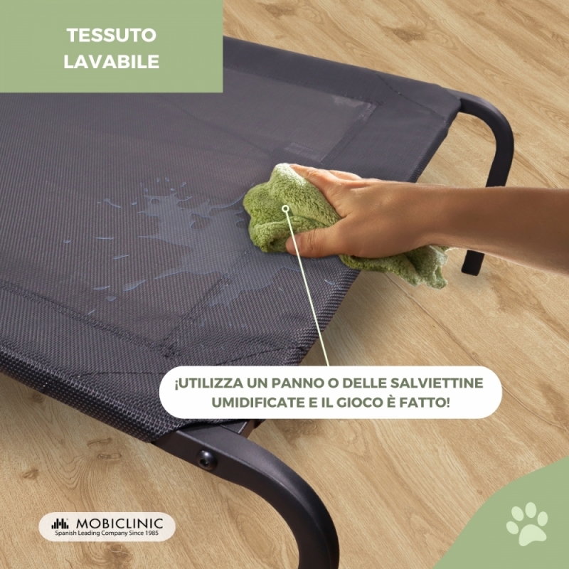 Il letto Cleo offre grande facilità nella pulizia, poiché permette di lavare la rete con salviette o direttamente applicando acqua. Per una pulizia più approfondita è sufficiente utilizzare un sapone neutro o un detergente naturale su tutte le superfici e risciacquare abbondantemente. Avrai l'area di riposo del tuo animale domestico completamente pulita!