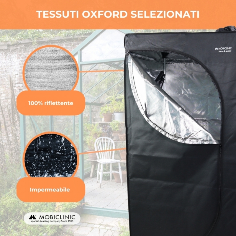 MATERIALI RESISTENTI: La tenda da coltivazione Growbox è realizzata in tessuto di nylon spesso e resistente agli strappi. Include cerniere appositamente progettate per impedire l'ingresso e l'uscita della luce, rendendole impermeabili al 100%. L'interno è rivestito con PREMIUM MYLAR 97% per la massima riflettività e distribuzione della luce. Le barre di supporto sono dotate di vernice riflettente bianca resistente all'umidità.