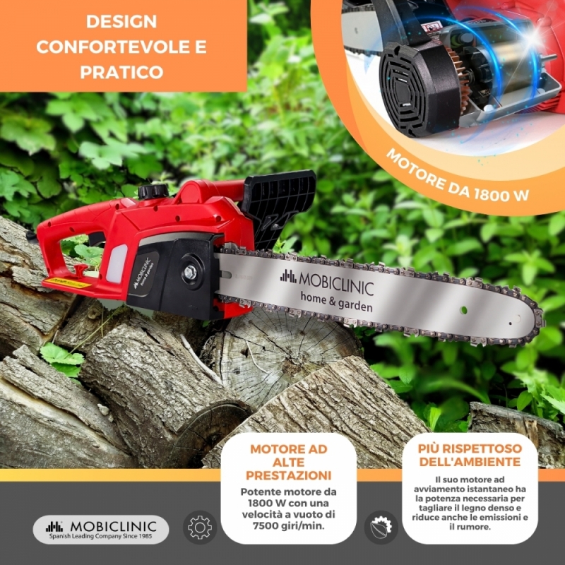 La motosega Timberpro è dotata di un motore elettrico da 1800 W ad alte prestazioni e una velocità a vuoto di 7500 giri/min, questa macchina fornisce una forza costante ed efficiente , tagliando facilmente il legno denso.