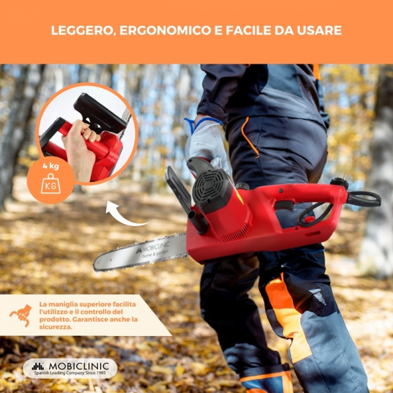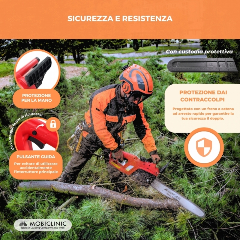 SICUREZZA: Con funzionalità di sicurezza integrate come il freno automatico della catena e la protezione per le mani, la motosega elettrica dà priorità alla sicurezza dell'utente. La motosega include una guaina per la barra e, per una maggiore sicurezza, la motosega è dotata di un blocco di sicurezza per evitare l'attivazione accidentale della motosega. . Queste funzionalità forniscono un ulteriore livello di protezione, garantendo un funzionamento sicuro in ogni momento.
