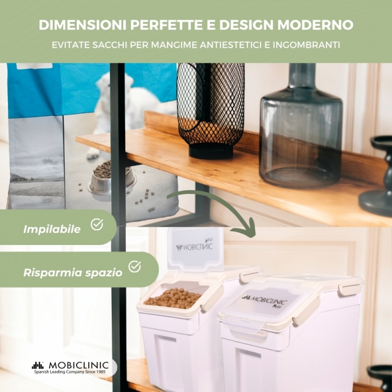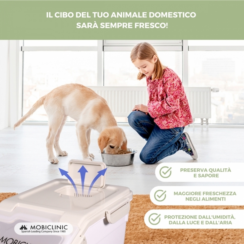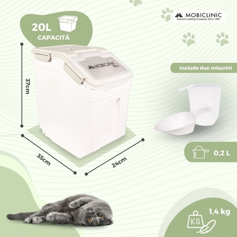 Contenitore mangime | 8 Kg - 20 L | Chiusura ermetica | Con ruote | Include pala e dosatore | Bianco | FeedPet | Mobiclinic