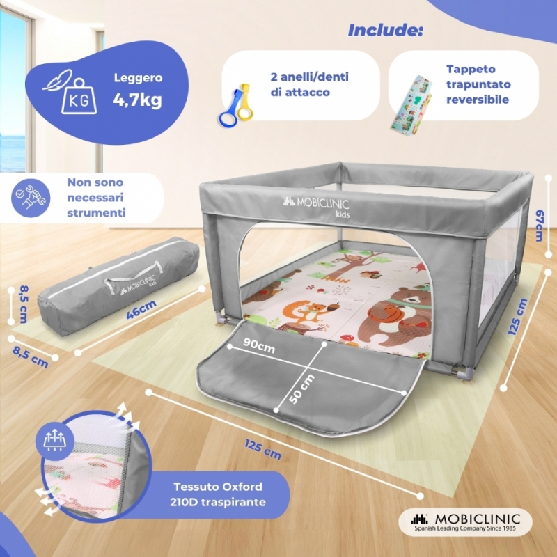 Box con tappeto | Neonati e bambini | 125x125x67cm| Pieghevole | Borsa per il trasporto | Grigio | Happyland | Mobiclinic