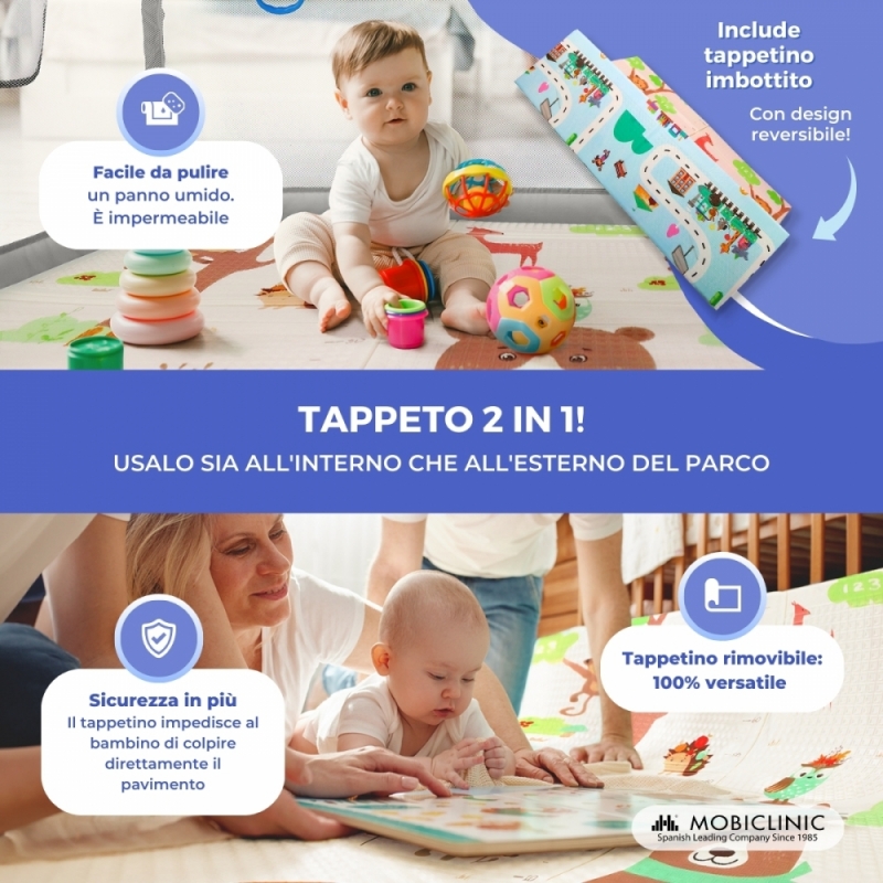 Include un tappetino imbottito che fornisce comfort e protezione . Inoltre, puoi utilizzare il tappetino sia all'interno che all'esterno del parco .