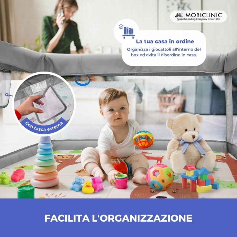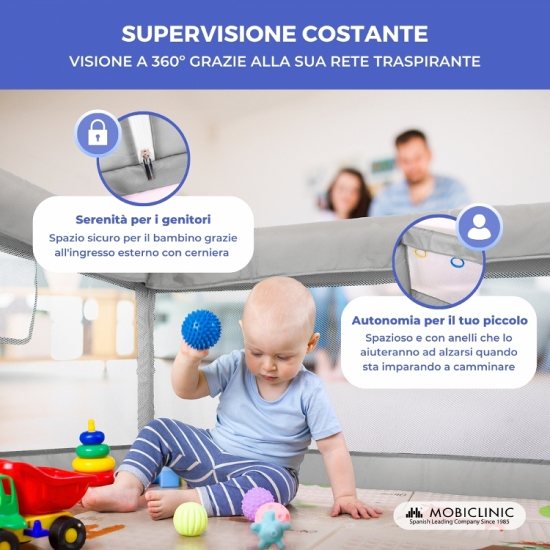 SORVEGLIANZA SEMPLIFICATA: La rete traspirante favorisce la ventilazione e la visione a 360º , consentendo ai genitori o agli operatori sanitari di svolgere altri compiti senza perdere di vista i più piccoli. Il box è utile per contenere temporaneamente il bambino durante attività come cucinare , pulire o ricevere visite in casa, senza bisogno di una costante supervisione.