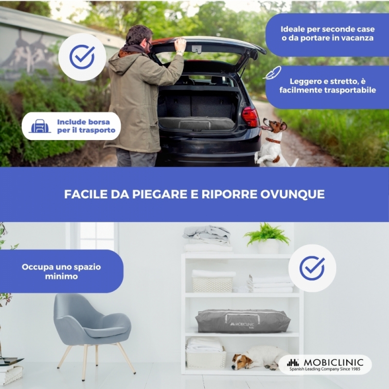 La portabilità è un aspetto chiave del design. Pieghevole e dotato di borsa per il trasporto , questo box può essere facilmente smontato e reinstallato a casa dei parenti o durante le vacanze. Il suo design compatto occupa meno spazio rispetto ai box in plastica e ne facilita il trasporto.