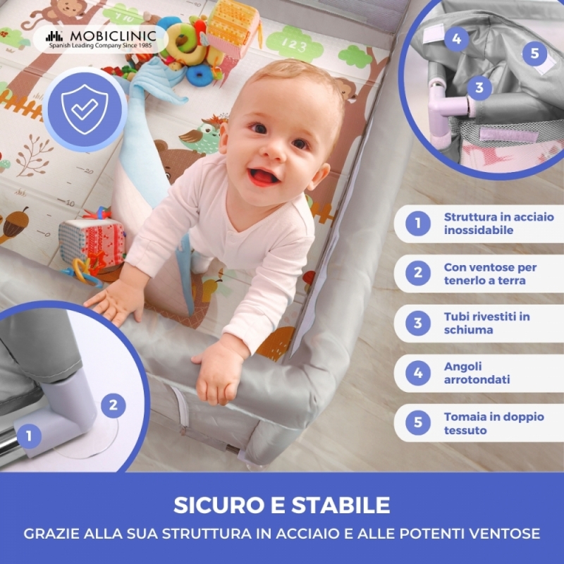 Il box Happyland con tappeto è progettato per offrire uno spazio sicuro e divertente per i bambini piccoli. La sicurezza è uno dei suoi principali vantaggi, poiché aiuta a mantenere i bambini all'interno di un'area definita , evitando possibili lesioni o l'accesso a zone pericolose della casa.