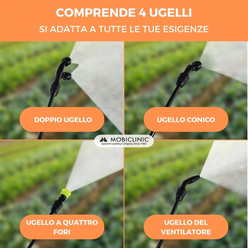 ADATTABILITA' A DIVERSI COMPITI: L'irroratore è dotato di 4 diversi ugelli o testine intercambiabili che si adattano alle diverse esigenze. Ciò conferisce loro versatilità, poiché possono essere utilizzati per applicazioni specifiche, come trattamenti localizzati o copertura estesa.