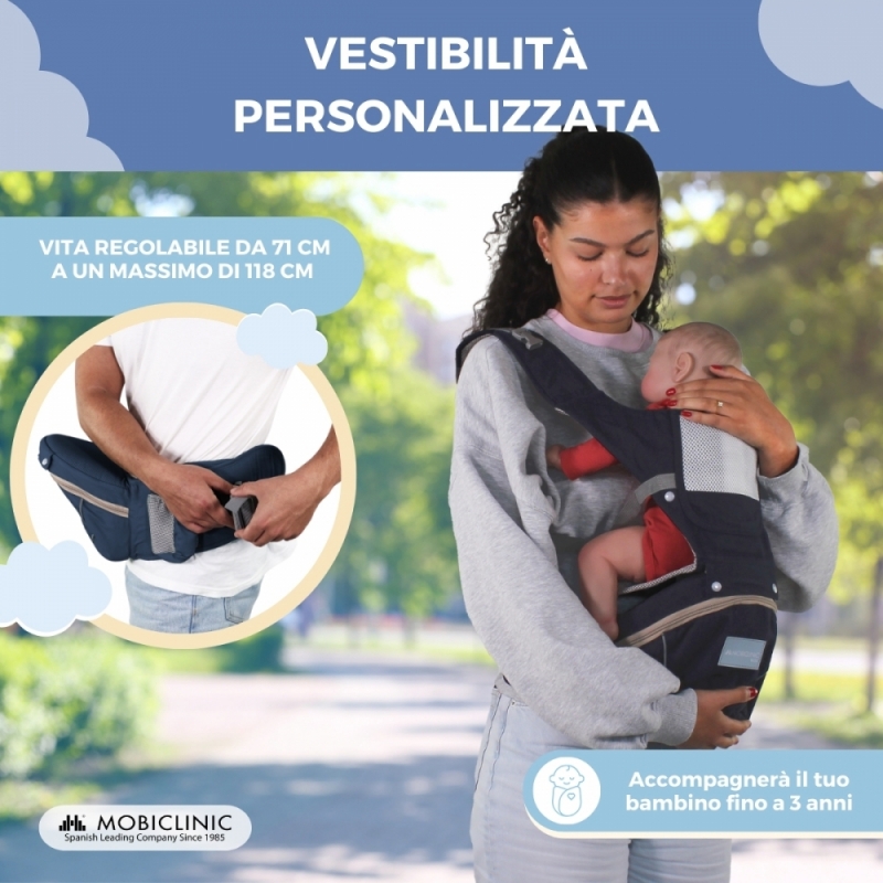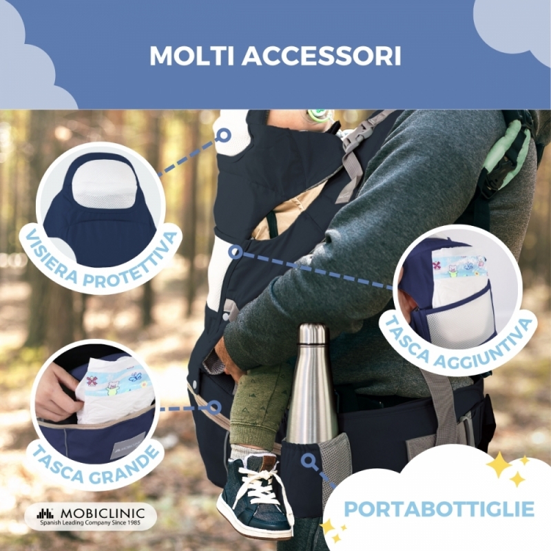 ORGANIZZAZIONE E ACCESSIBILITÀ: Il marsupio include una pratica tasca con cerniera per riporre facilmente gli effetti personali del bambino , consentendo un accesso rapido e comodo agli oggetti essenziali (pannolini, ciucci, chiavi, fazzoletti, documentazione, telefono cellulare, snack, piccoli spiccioli....) . Inoltre, dispone di un poggia bottiglia laterale per una maggiore comodità.
