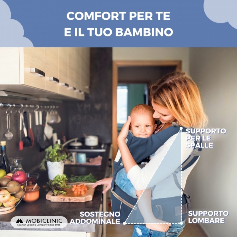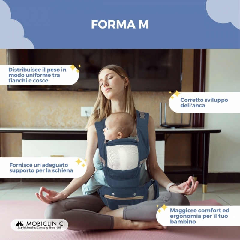 POSIZIONE ERGONOMICA M: Il marsupio favorisce la postura ergonomica del bambino permettendogli di adottare la naturale posizione accovacciata . Quando il bambino è seduto, lo zaino offre una posizione favorevole a forma di M, ottimale per lo sviluppo e il comfort del piccolo, garantendo un adeguato sostegno alla schiena e ai fianchi.