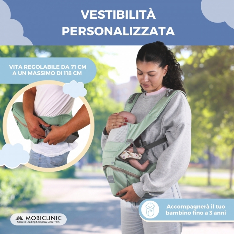 ORGANIZZAZIONE E ACCESSIBILITÀ: Il marsupio include una pratica tasca con cerniera per riporre facilmente gli effetti personali del bambino , consentendo un accesso rapido e comodo agli oggetti essenziali (pannolini, ciucci, chiavi, fazzoletti, documentazione, telefono cellulare, snack, piccoli spiccioli....) . Inoltre, dispone di un poggia bottiglia laterale per una maggiore comodità.
