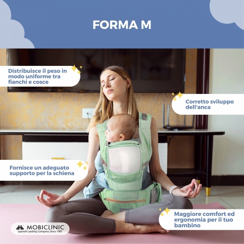 POSIZIONE ERGONOMICA IN M: Il marsupio favorisce la postura ergonomica del bambino permettendogli di adottare la naturale posizione accovacciata . Quando il bambino è seduto, lo zaino garantisce una posizione favorevole a forma di M, ottimale per lo sviluppo e il comfort del piccolo, garantendo un adeguato sostegno alla schiena e ai fianchi.