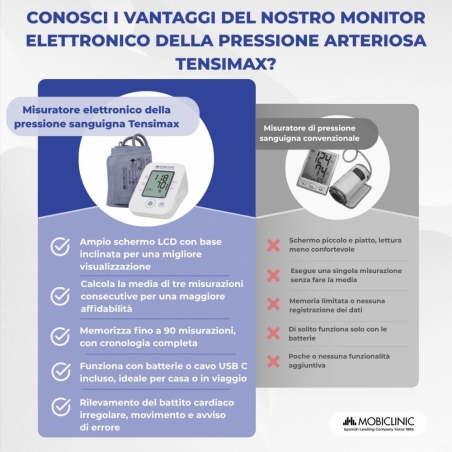 CONTROLLO TOTALE: Il misuratore di pressione sanguigna Tensimax rileva battiti cardiaci irregolari durante la misurazione, aiutando a identificare possibili aritmie cardiache. Memorizza inoltre fino a 90 registrazioni individuali, garantendo un monitoraggio continuo della pressione sanguigna nel tempo. Include anche una funzione di media per tre misurazioni consecutive, per risultati più affidabili e rappresentativi.