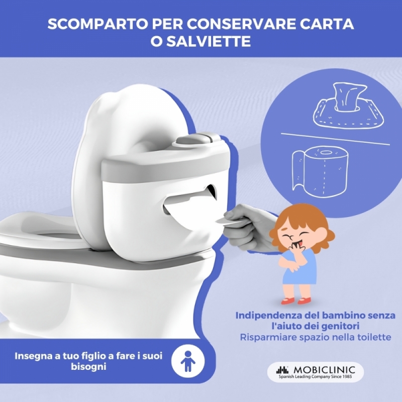 VANO CARTA: ToiKid dispone di un'area specifica per depositare la carta igienica o le salviette nella parte in cui andrebbe la cisterna. Per risparmiare spazio , la toilette prevede anche questo vano in modo che il bambino inizi ad avere indipendenza per fare i suoi bisogni da solo, senza l'aiuto dei genitori.