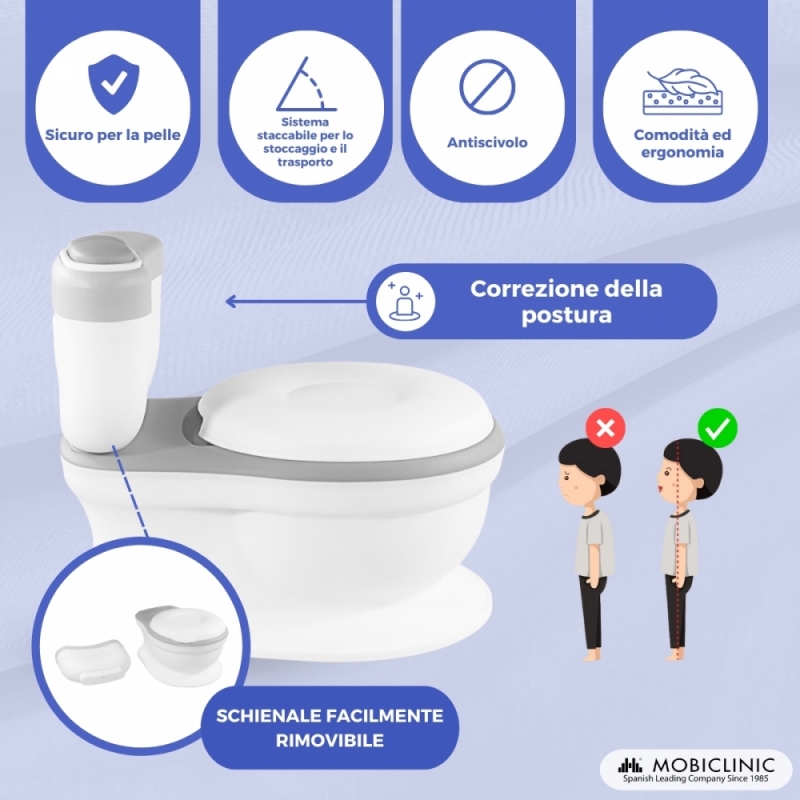 Il design di questa toilette per bambini è studiato per garantire il comfort e la corretta postura del bambino grazie al suo schienale. Allo stesso modo, la sua superficie antiscivolo impedirà incidenti occasionali o che il prodotto si muova facilmente.