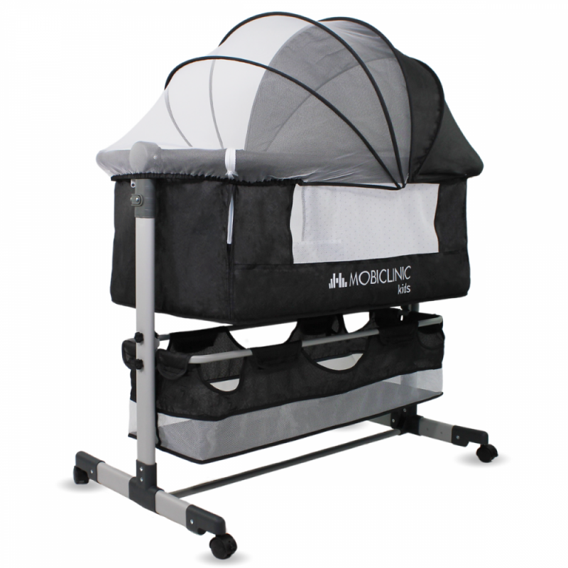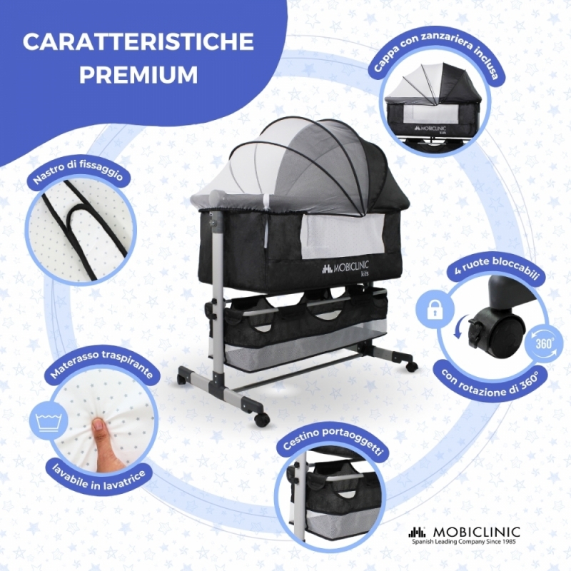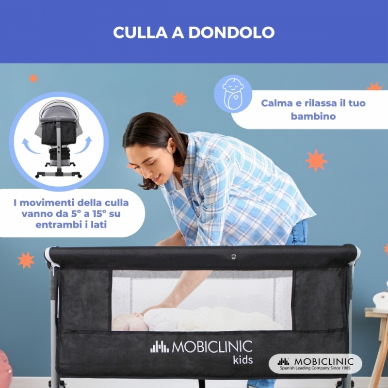 Culla 3 in 1 | Co-sleeping |Dondolo | 3 altezze regolabili| Zanzariera e cestino |Con materasso | Ruote 360° | Night| Mobiclinic
