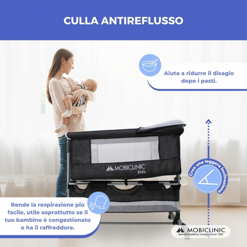 - Culla antisoffocamento: la culla Night consente di sollevare un lato più in alto dell'altro, creando una leggera inclinazione che aiuta a ridurre il disagio dopo le poppate e facilita la respirazione, particolarmente utile se il bambino è congestionato o ha il raffreddore.
