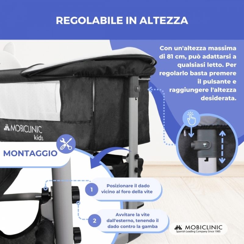 La culla Night è dotata di un sistema di regolazione dell'altezza a tre livelli: 76 cm, 79 cm e 81 cm , adattandosi a qualsiasi letto. Le sue quattro ruote ruotano di 360° , consentendo di spostare facilmente la culla in tutta la casa, assicurandoti di avere sempre il tuo bambino vicino, ovunque tu sia.
