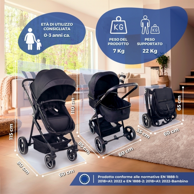 - Peso massimo supportato: 22 kg in base alla normativa EN 1888-2:2018+A1:2022