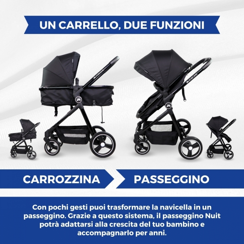 Scopri il passeggino Nuit, progettato per offrire il massimo comfort e versatilità in ogni momento delle tue passeggiate. Goditi la morbidezza dei viaggi grazie alla capottina ripiegabile che fornisce protezione solare, e regola lo schienale con una cinghia regolabile per garantire il massimo comfort al tuo piccolo. Inoltre, dispone di un ampio cestino portaoggetti per trasportare tutte le cose del bambino, snack, pranzo, giocattoli, ecc. Il poggiapiedi è regolabile.