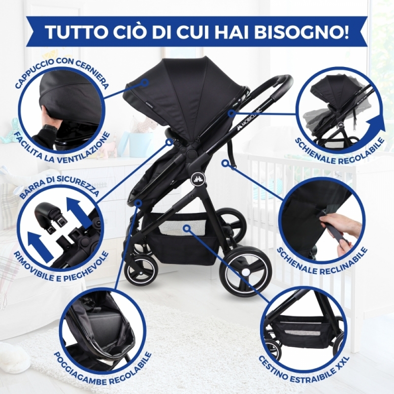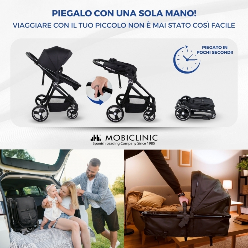 Passeggino 2in1 |Chiudibile ultra compatto |Leva singola |Cintura a 5 punti |Barra removibile |Max. 22kg |Nero |Nuit |Mobiclinic