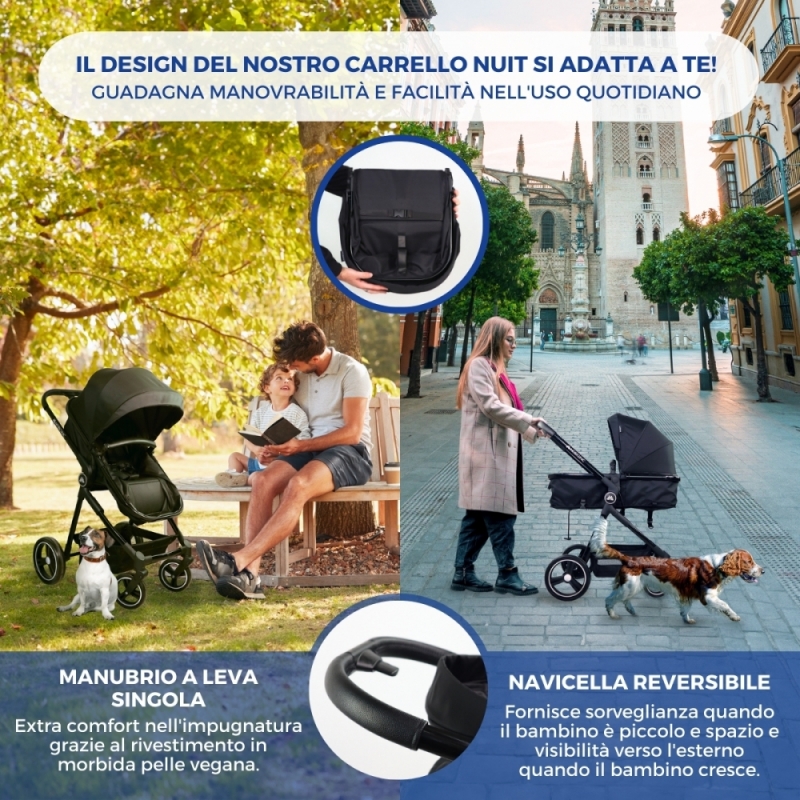 SICUREZZA E CONVENIENZA: Con il passeggino Nuit, puoi proteggere il tuo bambino con l' imbracatura a 5 punti mentre ti godi la comodità del freno a pedale one-touch. La barra di sicurezza è facilmente rimovibile per una maggiore comodità. Inoltre, il seggiolino è reversibile , permettendogli di essere installato in posizione fronte strada o fronte mamma in modo che il bambino possa interagire con i genitori rivolti all'indietro o con l'ambiente rivolto in avanti. Questa opzione è ideale per risparmiare spazio a casa, in viaggio o per riporlo.