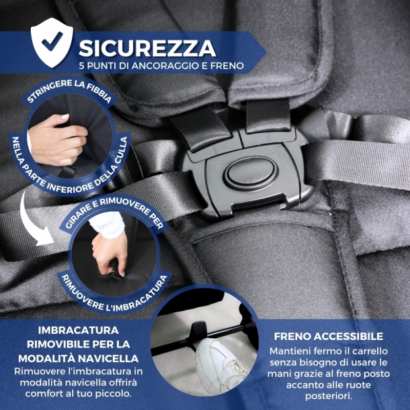 Sicurezza e comodità sono in prima linea con l' imbracatura a 5 punti , che protegge il tuo piccolo mentre si gode la facilità della frenata con un solo tocco. La barra di sicurezza facilmente rimovibile aggiunge ulteriore comfort.