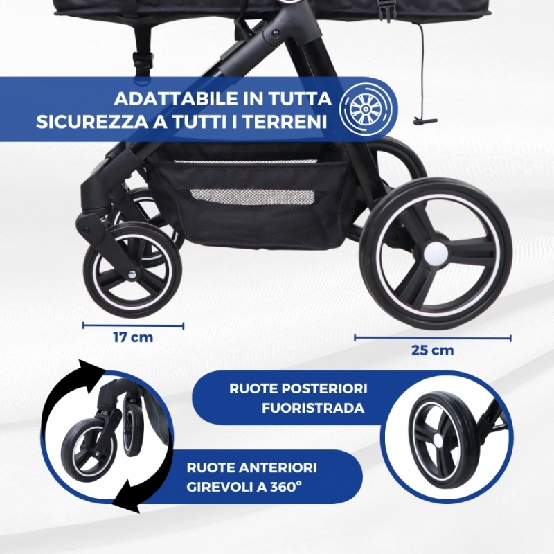 RUOTE PER QUALSIASI AVVENTURA: Supera tutti i terreni con le ruote posteriori fuoristrada e le ruote anteriori girevoli a 360º .