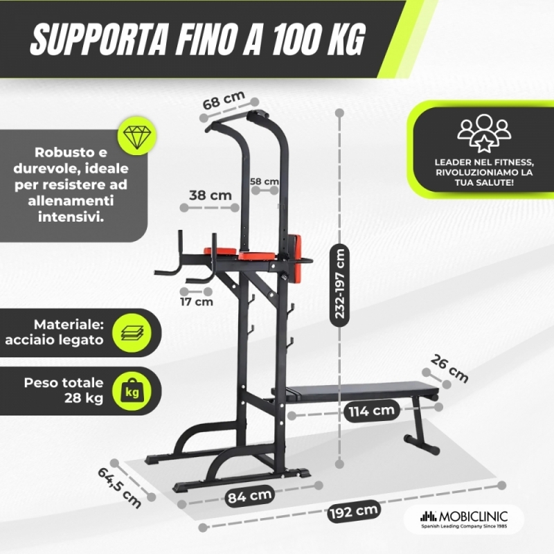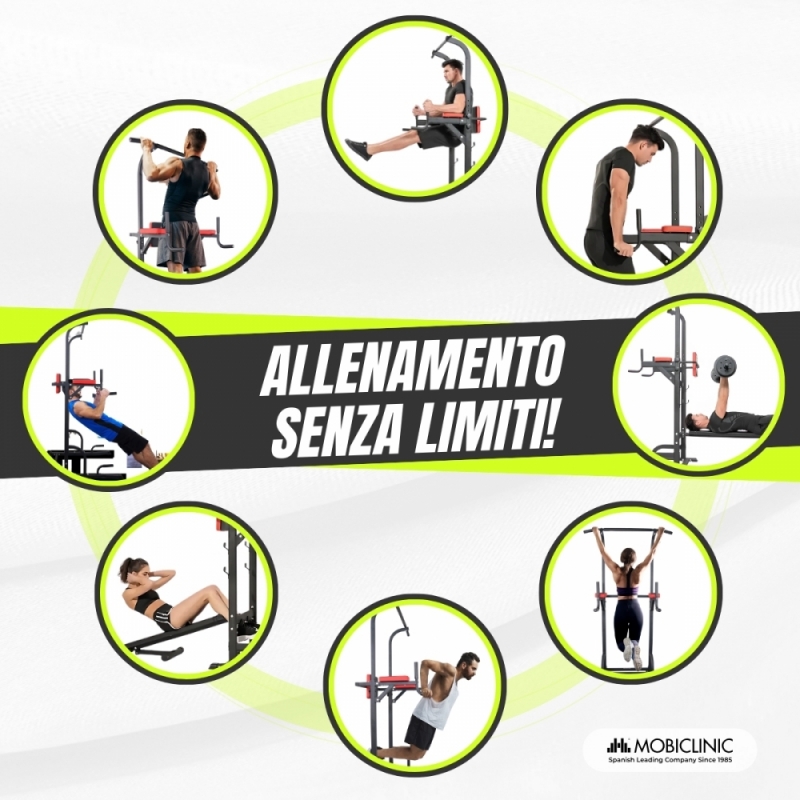 Le impugnature ergonomiche antiscivolo consentono una presa comoda, evitando posture scorrette che potrebbero danneggiare i polsi. Inoltre, lo schienale fornisce ulteriore supporto per esercizi come il sollevamento delle gambe, garantendo una pratica più sicura ed efficiente. Con dimensioni pieghevoli, questa stazione è facile da riporre e trasportare , rendendola un'opzione ideale per chi desidera una palestra a casa senza occupare troppo spazio.