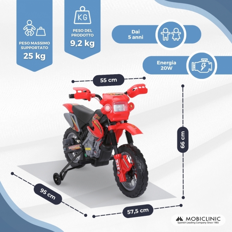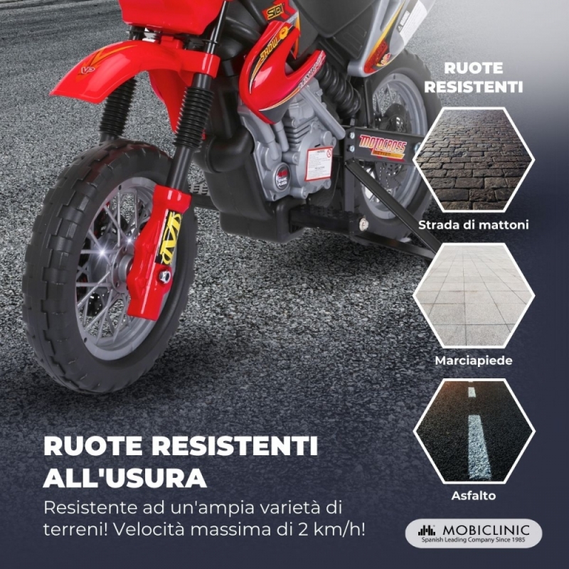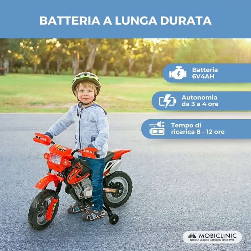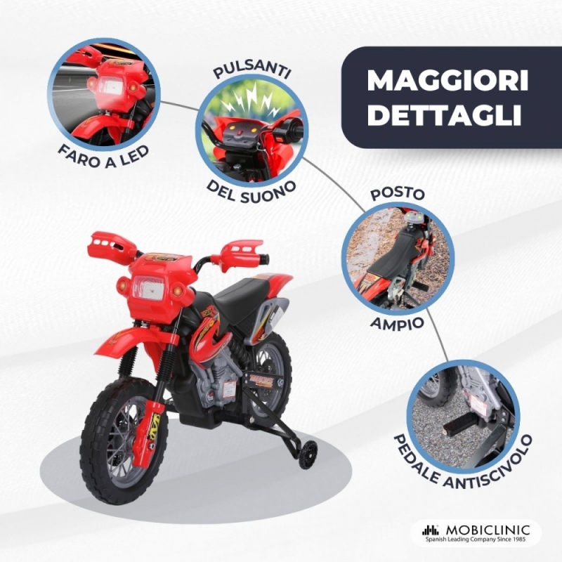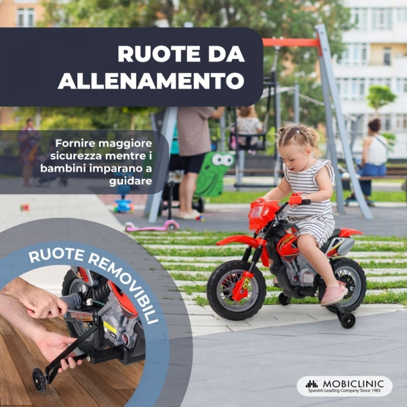 Motocicletta elettrica bambini| Audio | Pulsante di avanzamento | Luce | Ruote da allenamento | Batteria | MobiCross |Mobiclinic