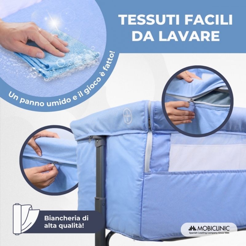 Questo modello di culla co-sleeping è davvero confortevole grazie alla possibilità di apertura laterale per servire il bambino in base all'altezza richiesta dal nostro materasso. Allo stesso modo, è un lettino facile da trasportare e da montare grazie alle sue dimensioni e alle due ruote. Include una piccola base semirigida e piatta di 3 cm di spessore e una borsa per il trasporto per un facile smontaggio e stoccaggio.