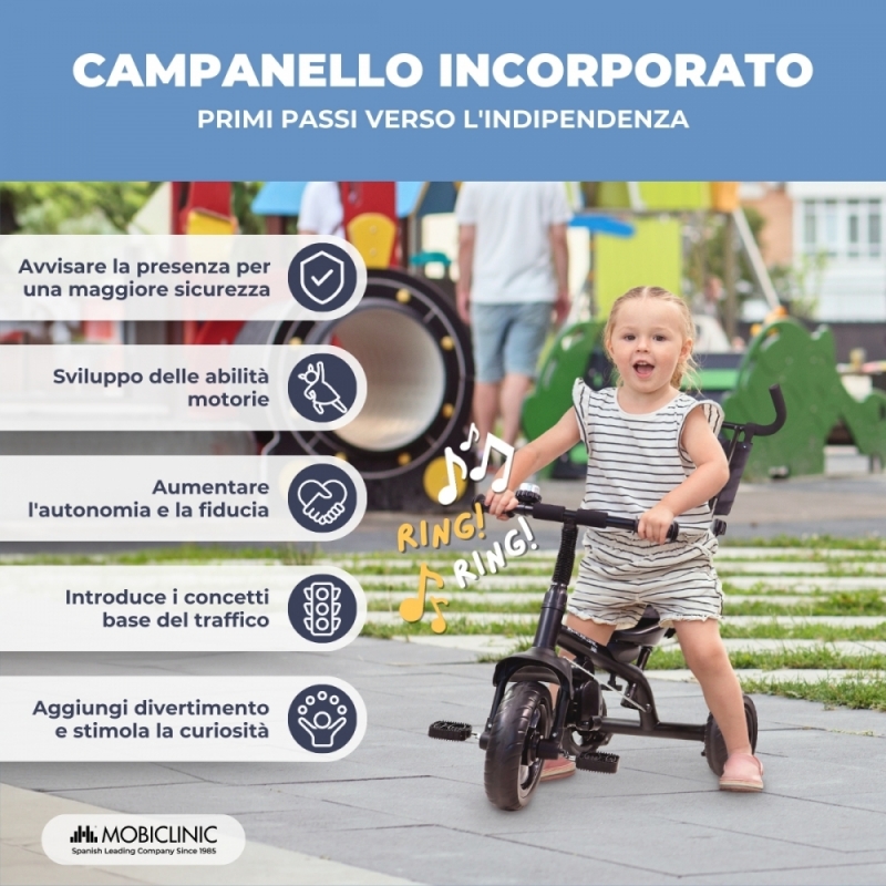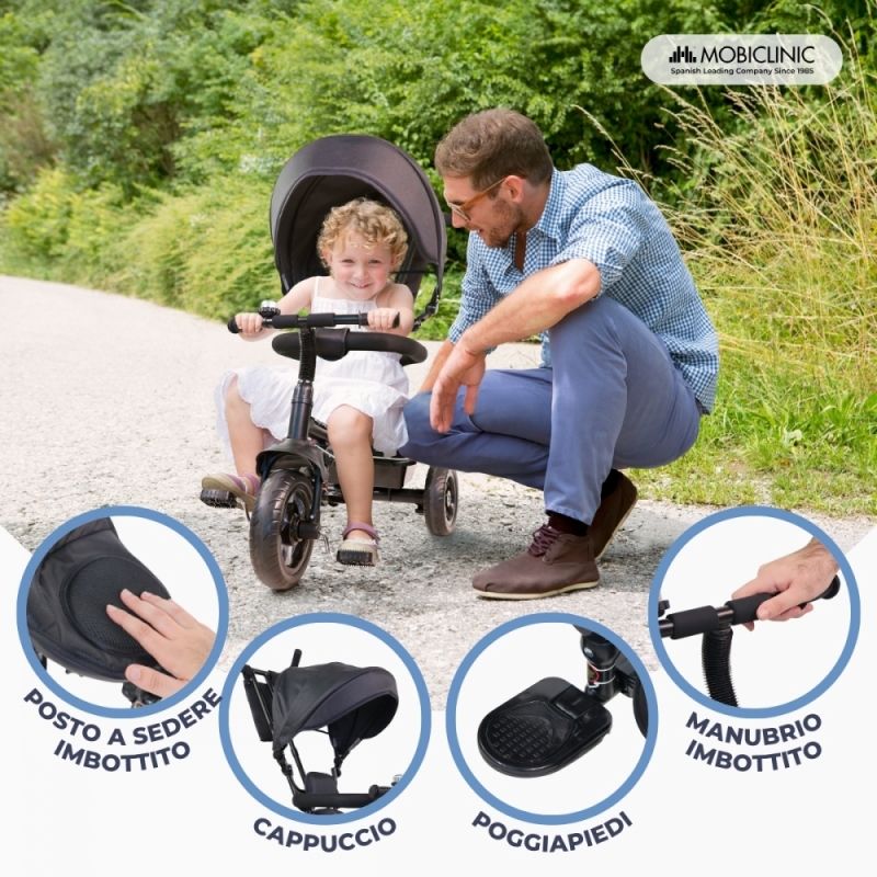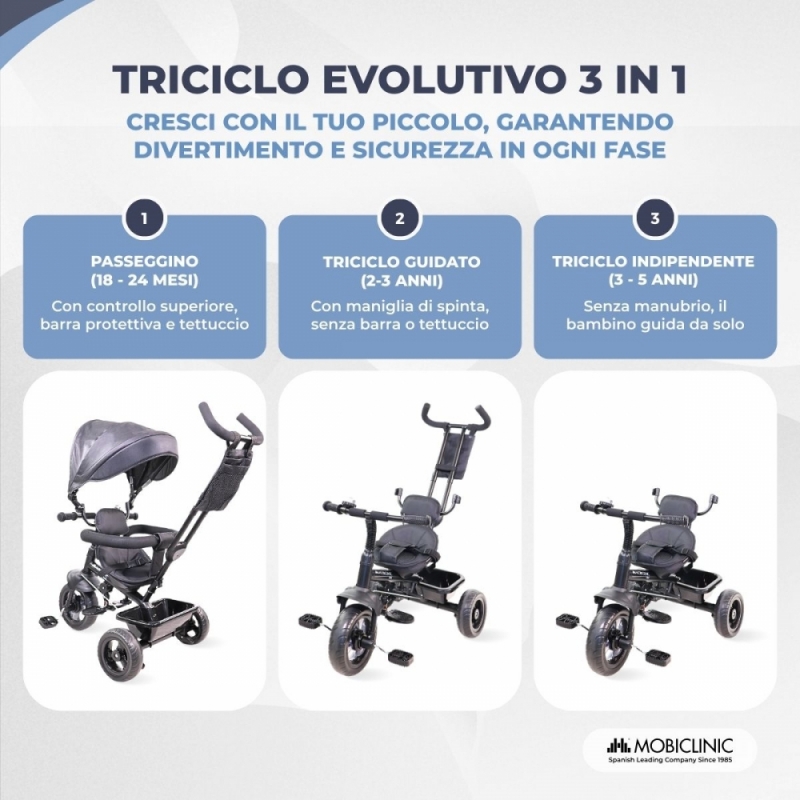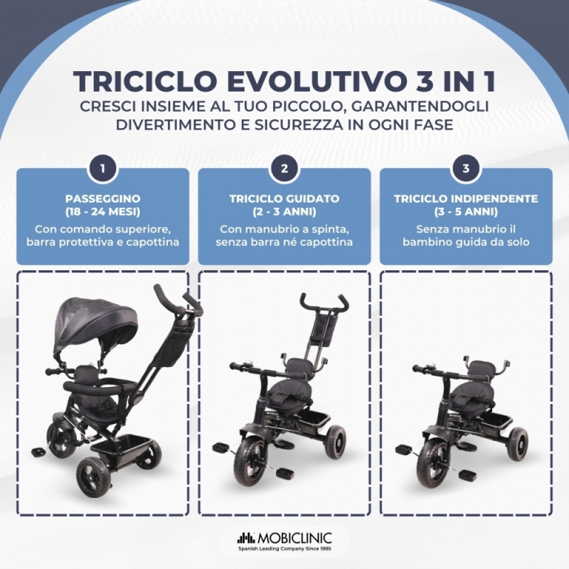 TRICICLO EVOLUZIONARIO 3 IN 1 : questo triciclo adatta il suo utilizzo allo sviluppo delle capacità dei nostri piccoli. Dal controllo parentale fino a diventare un elemento autonomo di divertimento e intrattenimento. Progettato per bambini da 18 mesi a 5 anni con un peso massimo di 25 kg.