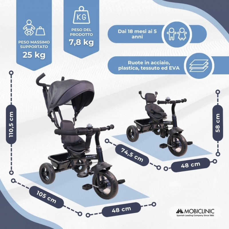 Misurando 111 x 104 x 48 cm e pesando 7,5 kg , questo triciclo è realizzato per essere resistente e allo stesso tempo facile da maneggiare. Questo prodotto supporta un peso massimo di 25 kg per utente.