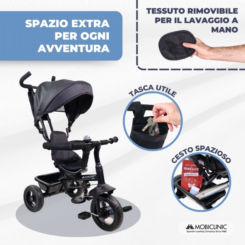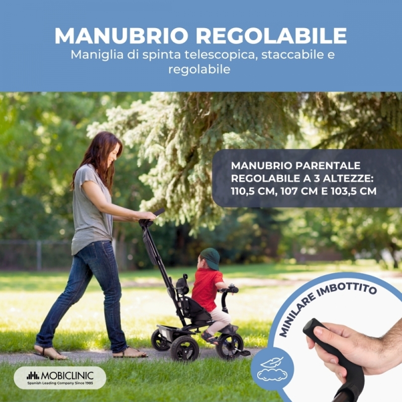 Questo triciclo è progettato per offrire un'esperienza comoda e pratica sia ai bambini che ai genitori, rendendolo un'ottima opzione per l'uso quotidiano. Dispone di sedile e schienale imbottiti che garantiscono il comfort dei più piccoli, di una capottina regolabile per proteggerli dal sole e dal vento e di uno spazio portaoggetti con cestello inferiore per trasportare giocattoli, zaini o qualsiasi altro oggetto necessario durante la passeggiata, e una borsa nella maniglia superiore per riporre gli oggetti più piccoli. Questo doppio sistema di stoccaggio consente ai genitori di trasportare facilmente tutto ciò di cui hanno bisogno senza trasportare oggetti aggiuntivi. La maniglia di spinta è regolabile in 3 altezze: 111 cm – 107,5 cm – 105 cm, che offriranno maggiore comfort ai genitori.