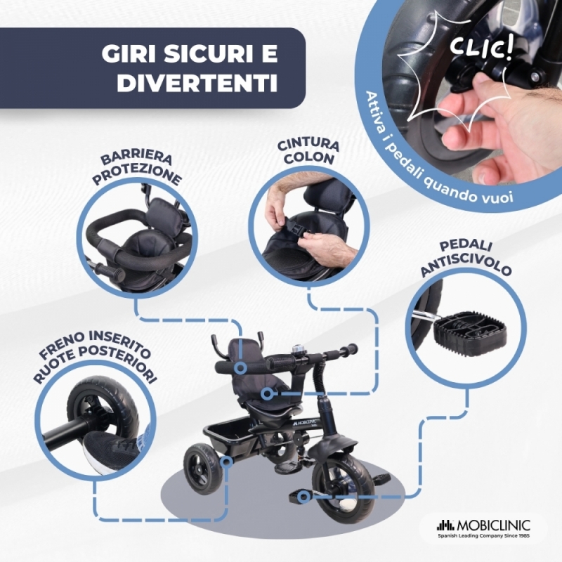 SICURO : il triciclo è dotato di cintura di sicurezza e barriera protettiva. Inoltre, include un freno sulla ruota posteriore e un pulsante della frizione, che permette al bambino di utilizzare i pedali senza spostare la ruota per una maggiore sicurezza. I pneumatici compositi EVA possono essere utilizzati sia all'interno che all'esterno della città e offrono una guida fluida e silenziosa.