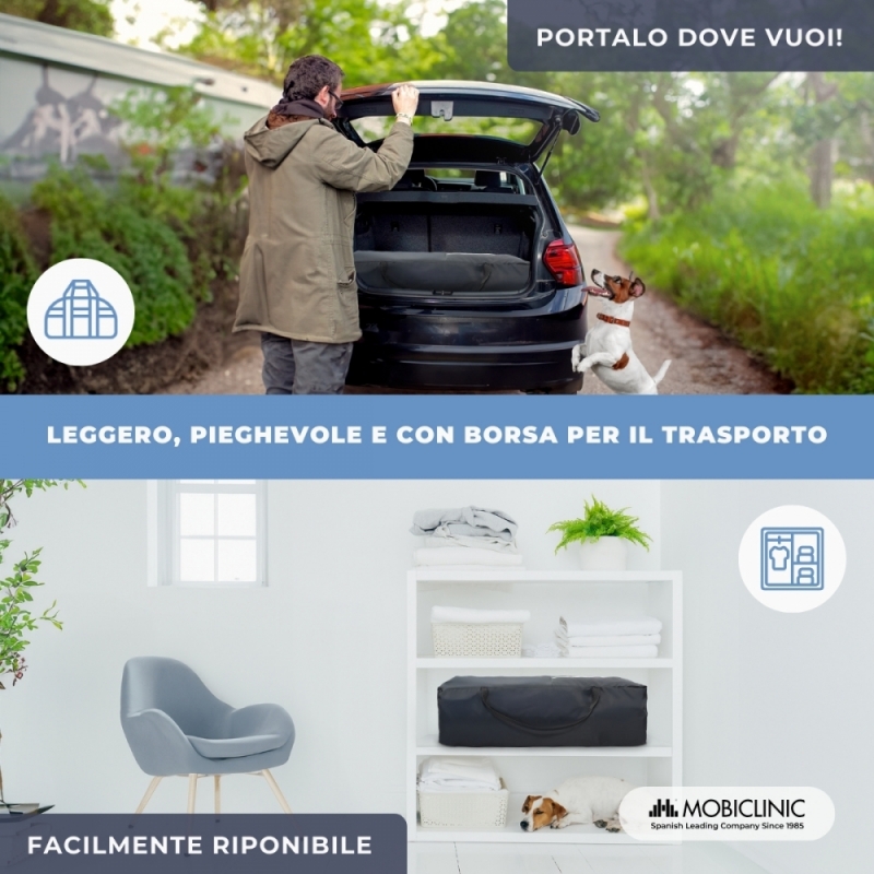 PIEGHEVOLE E COMPATTO: Il processo di piegatura è rapido e semplice in pochi passaggi, il che lo rende facile da riporre e trasportare, occupando il minor spazio possibile. Inoltre contiene una borsa per il trasporto con la quale potrai portarlo ovunque, ideale per i viaggi.