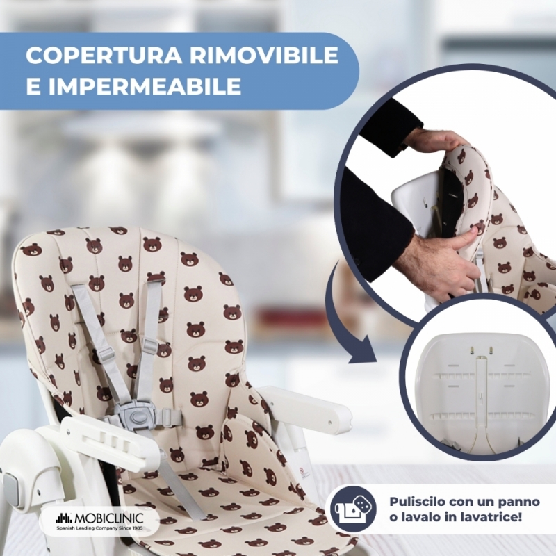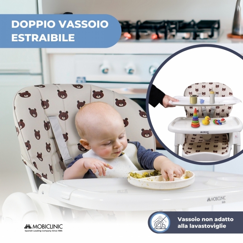 I suoi materiali sono studiati per un'igiene rapida ed efficace in caso di macchie sia solide che liquide. Pertanto, il suo doppio vassoio aiuta a garantire che i resti di cibo non rimangano incastrati e possano essere lavati direttamente con un panno umido.