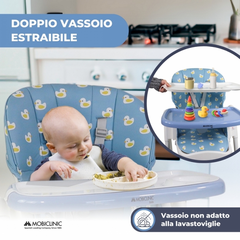I suoi materiali sono studiati per un'igiene rapida ed efficace in caso di macchie sia solide che liquide. Pertanto, il suo doppio vassoio aiuta a garantire che i resti di cibo non rimangano incastrati e possano essere lavati direttamente con un panno umido.