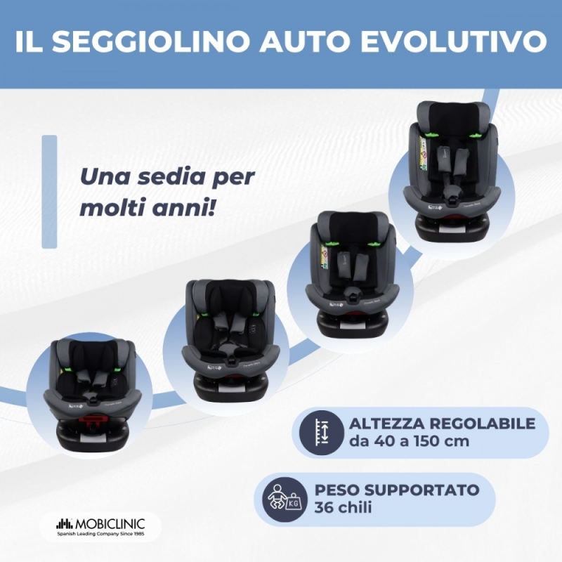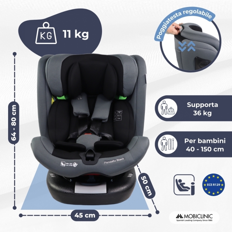 Il seggiolino auto per bambini Pandafix unisce sicurezza, comodità e versatilità, diventando il compagno ideale per ogni fase della crescita del bambino. Progettata per proteggere da 167 giorni a 12 anni circa (40-150 cm/36 kg), questa sedia si distingue per la sua tecnologia avanzata e la sua capacità di adattarsi alle mutevoli esigenze del bambino e della famiglia.