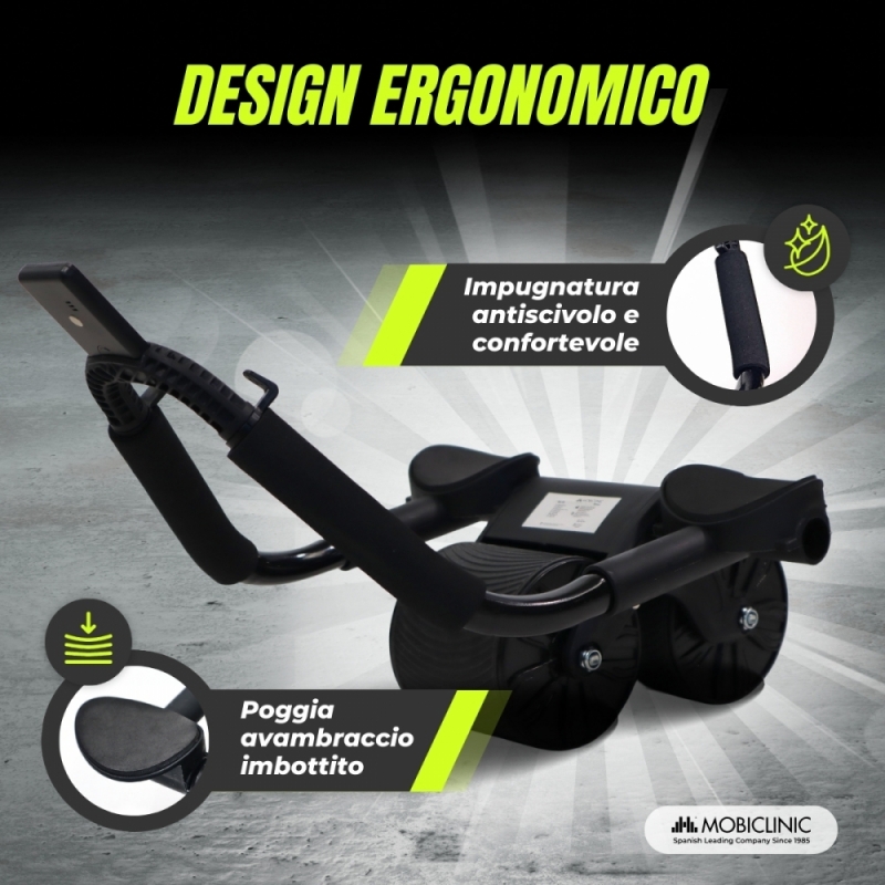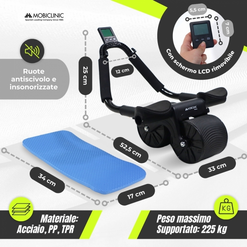 Questo rullo è dotato di tre accessori che lo rendono ancora più completo, un timer digitale per stabilire intervalli di lavoro e controllare il tempo dei tuoi esercizi, ottimizzando al massimo ogni sessione, questo ti permette di migliorare le prestazioni e seguire una routine strutturata. Dispone inoltre di due supporti per telefono che ti permetteranno di guardare video o seguire applicazioni di allenamento durante i tuoi esercizi, rendendo le tue routine più interattive e motivanti. Infine, è dotato di tappetino antiscivolo che garantisce uno spazio sicuro e confortevole per il tuo allenamento, proteggendo le ginocchia durante lo scivolamento e offrendo maggiore presa.