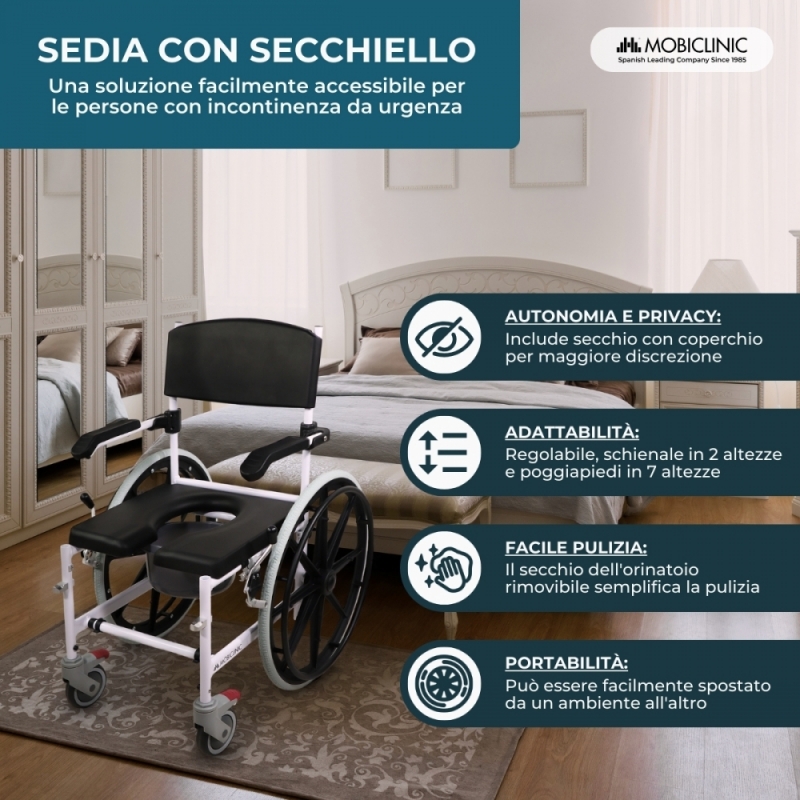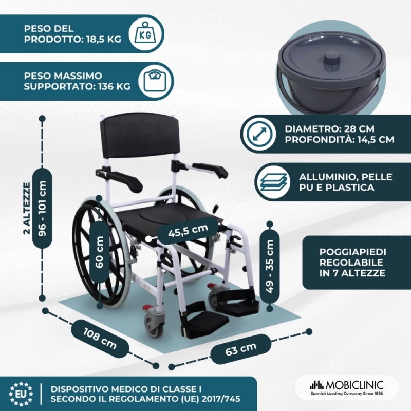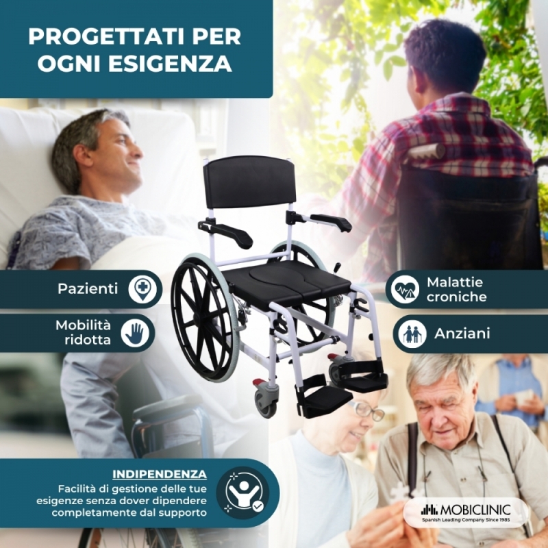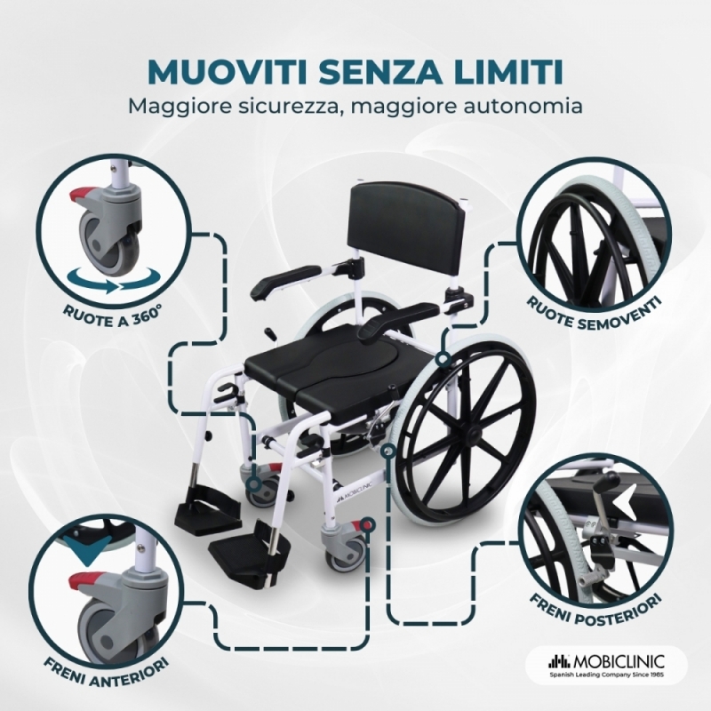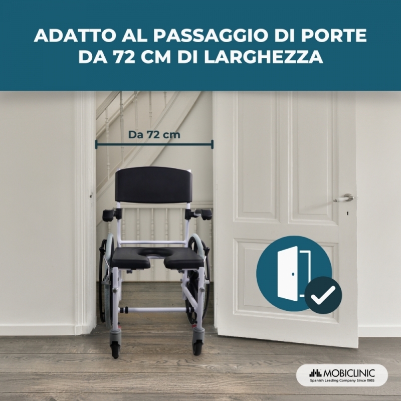 SEDIA MULTIFUNZIONE: Calígula è una sedia da bagno che aiuta a rendere più semplice il bagno per chi ne ha bisogno, consentendo di posizionare la sedia nella doccia. Ma è anche una sedia da water dotata di vasino rimovibile, il che ne aumenta il comfort e la sicurezza, e può essere utilizzata anche sul water (altezza inferiore a 46 cm e larghezza inferiore a 45 cm). Infine, può essere utilizzato come sedia da transito per facilitare gli spostamenti.