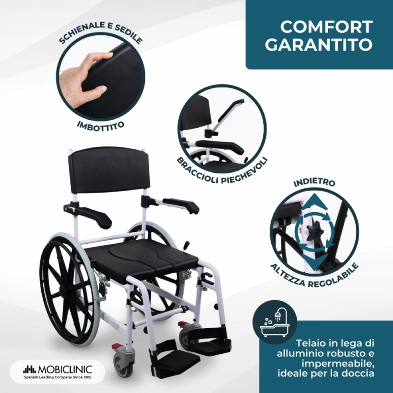 Realizzata con un telaio in lega di alluminio resistente e impermeabile, questa sedia è progettata per durare e sopportare l'uso quotidiano in condizioni di bagnato, come bagni o docce. Le ruote posteriori da 24 pollici semoventi permettono all'utente di muoversi con maggiore autonomia, mentre le ruote anteriori sono dotate di freni per garantire una stabilità ottimale durante l'utilizzo.