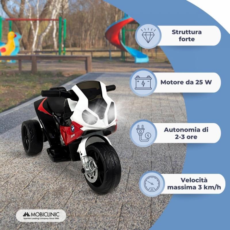 La motocicletta elettrica MobiXplo è la compagna perfetta per i piccoli motociclisti in cerca di avventure piene di divertimento e stile. Progettata per offrire un'esperienza emozionante e sicura, questa motocicletta combina funzionalità e design autentico che i ragazzi e le ragazze dai 18 mesi in su adoreranno. Con la garanzia della licenza ufficiale BMW, questa moto rispecchia i dettagli e la qualità di un vero veicolo, adattato alle dimensioni e alle esigenze dei più piccoli.
