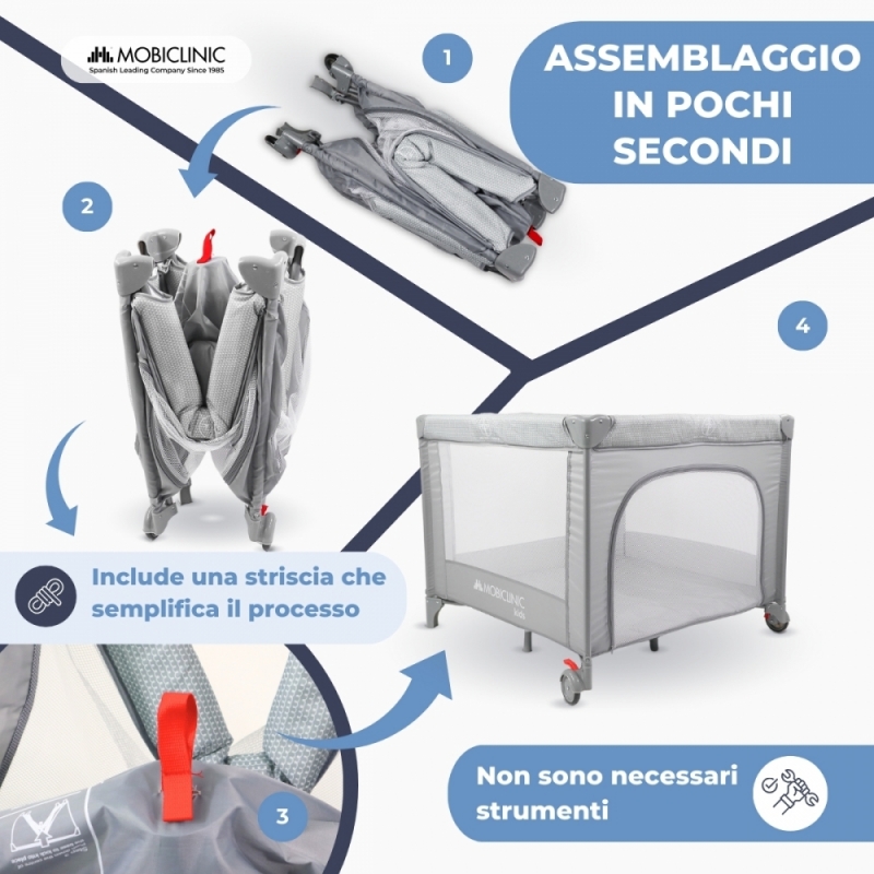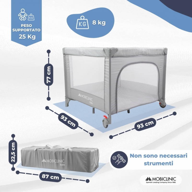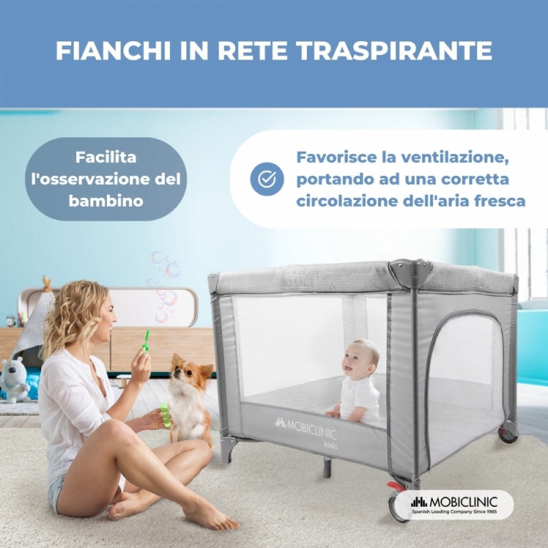 Realizzato con materiali di alta qualità, il box Sleepland è dotato di un comodo materasso che fornisce il supporto ideale sia per il riposo che per il gioco attivo. Il suo tessuto a rete traspirante permette una ventilazione ottimale, garantendo ai genitori un contatto visivo costante con i loro piccoli. L'apertura laterale con cerniera è una caratteristica pratica che facilita l'accesso, permettendo al bambino di entrare e uscire mentre gioca.