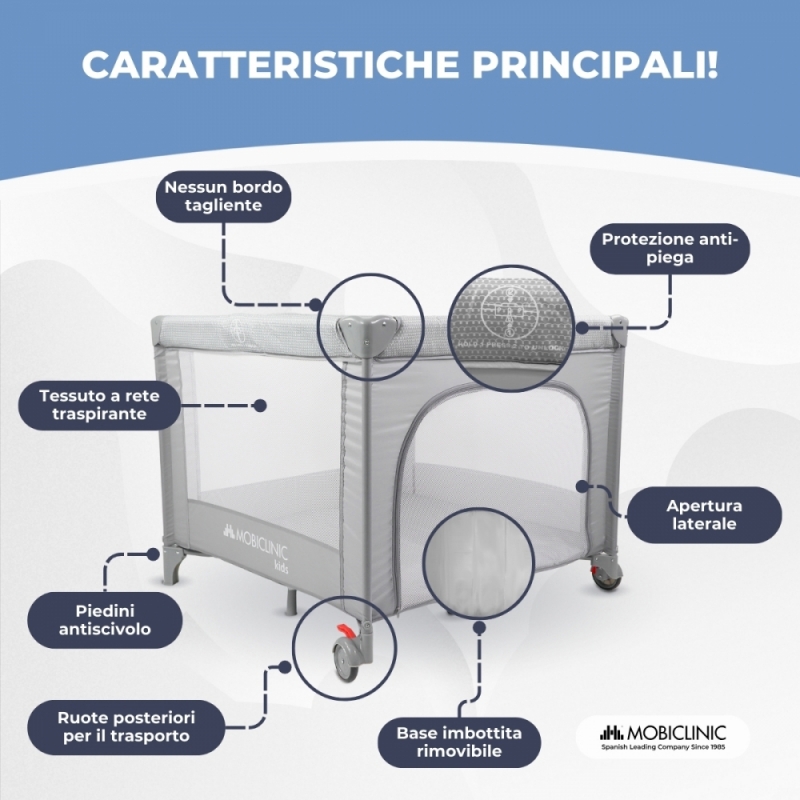 CARATTERISTICHE PRINCIPALI: Questo box per bambini è dotato di un comodo materasso che fornisce il supporto ideale sia per il riposo che per il gioco. Le sue ruote posteriori con freno consentono spostamenti facili e sicuri, mentre gli angoli resistenti e i piedini antiscivolo garantiscono stabilità e durata. Dispone inoltre di una rete traspirante che facilita la ventilazione e garantisce visibilità e di una pratica apertura laterale con cerniera.
