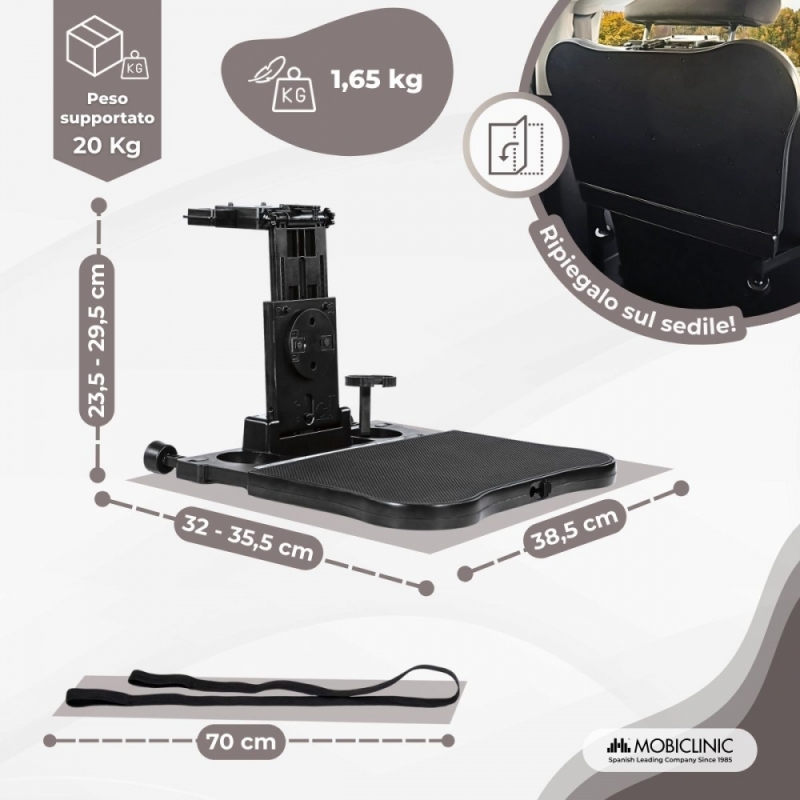 REGOLABILE E PIEGHEVOLE: Grazie ai suoi supporti regolabili, il vassoio ausiliario si fissa perfettamente allo schienale del sedile, garantendo stabilità e adattandosi a diversi modelli di sedile. Inoltre, il suo design pieghevole permette di chiuderlo facilmente quando non viene utilizzato, risparmiando spazio. Dispone inoltre di un sistema di bloccaggio che garantisce che si chiuda correttamente una volta piegato, offrendo maggiore sicurezza.